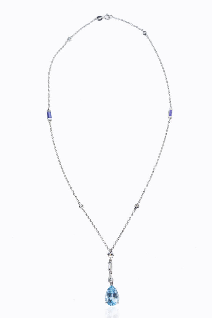 in oro bianco con goccia di acquamarina pendente di ct 3,97 ca, sormontata da diamanti taglio brillante, a goccia, baguette e carré per totali ct 0,55 ca