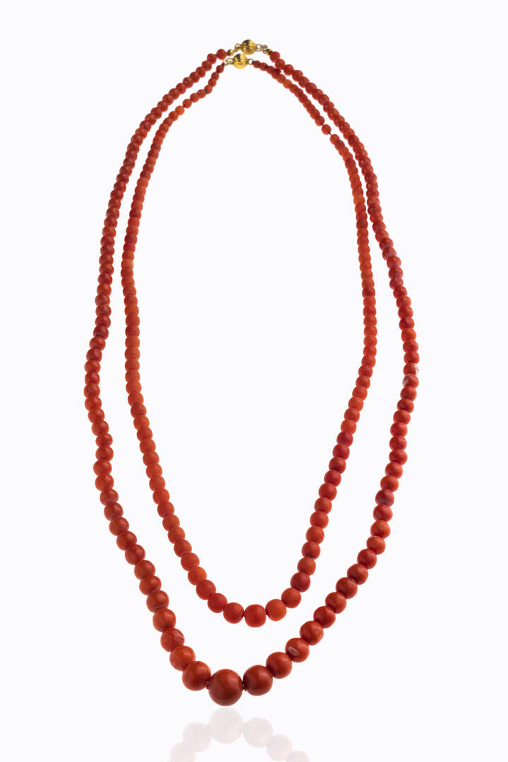 composte da sfere di corallo rosso mediterraneo a scalare del diam di mm da 4,6 a 9,5 e da 4 a 5,5. Chiusure in oro giallo a bariletto