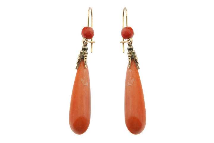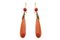 pendenti in oro giallo, ad amo, con gocce e sfere di corallo nei toni del salmone