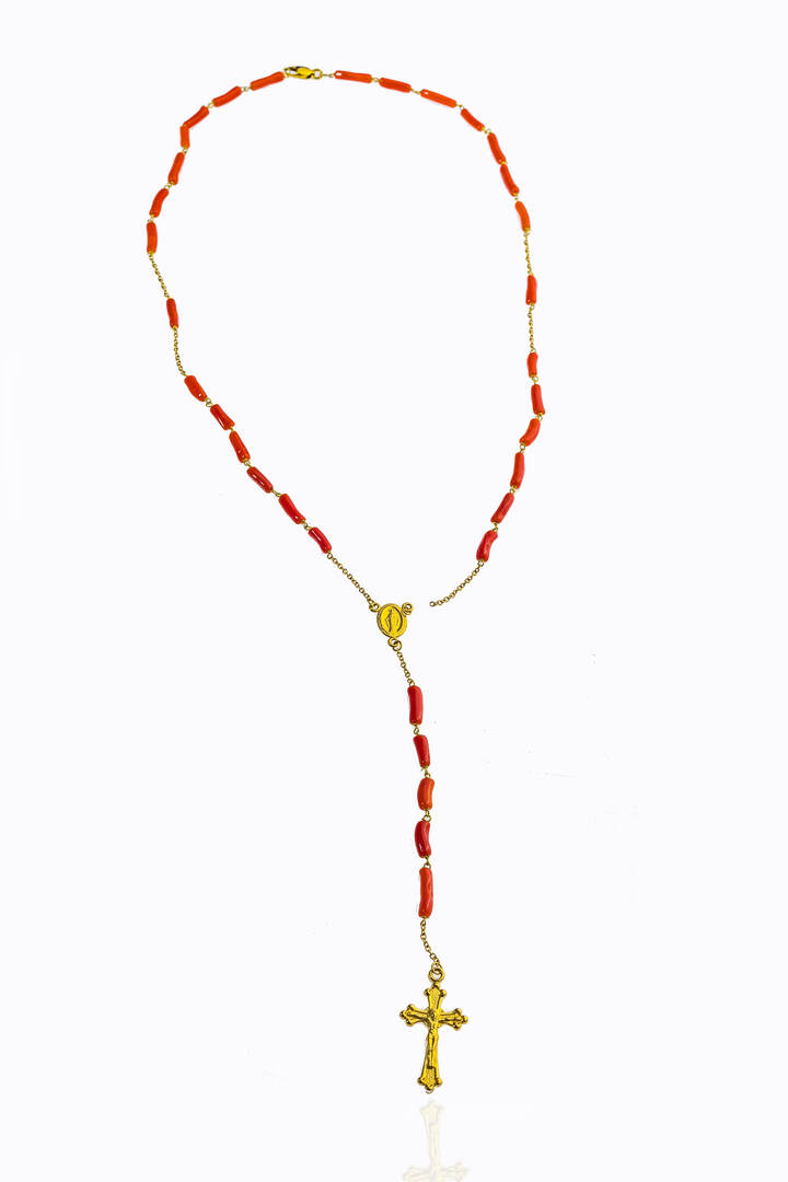 in oro giallo, composto da segmenti di corallo rosso mediterraneo. Croce e placca ovale in oro giallo