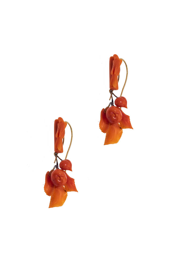 pendenti, XIX secolo, in oro a bassa caratura, ad amo, con foglie e fiori in corallo inciso