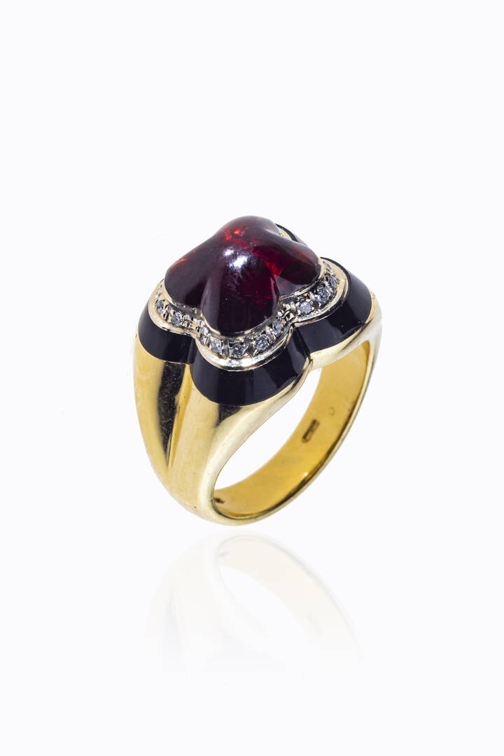 Anello in oro giallo, firmato "Re Carlo", con granato cabochon al centro, diamanti taglio brillante per totali ct 0,15 ca e fila esterna in smalto nero