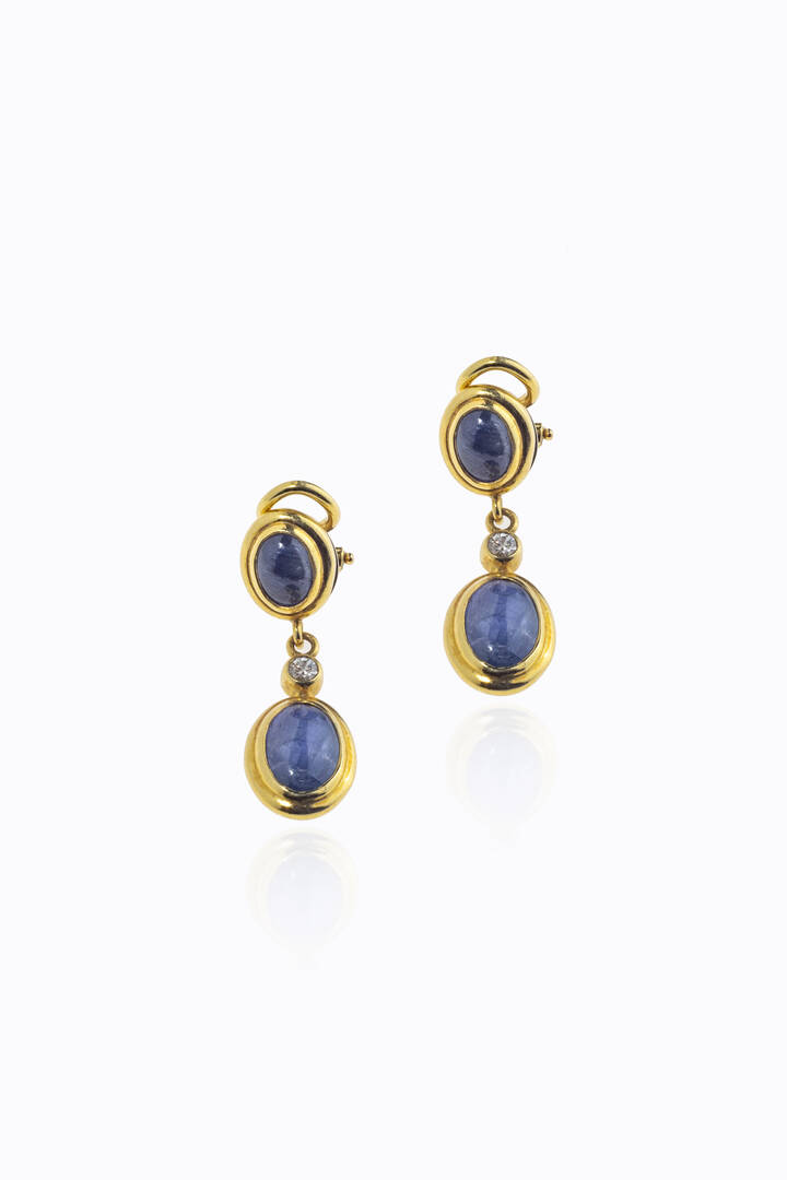 in oro giallo, a clip, con zaffiri taglio ovali cabochon per totali ct 6 ca e due diamanti taglio brillante per totali ct 0,10 ca
