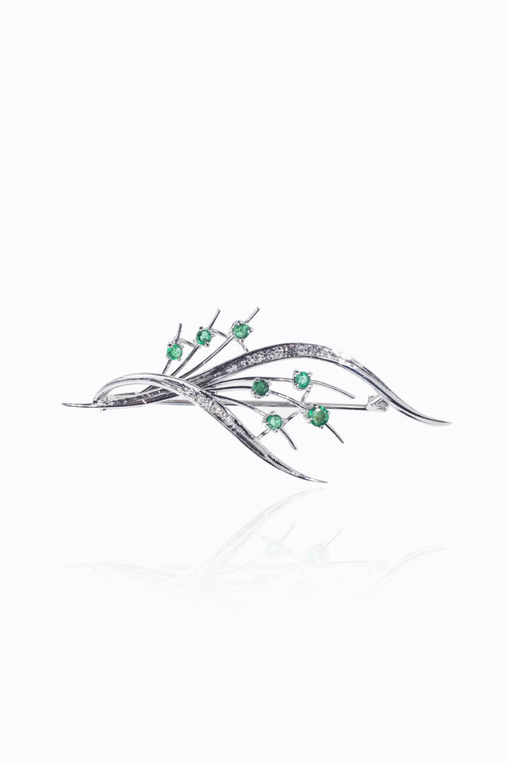 in oro bianco, a voluta, anni '50, con diamanti taglio 8/8 per totali ct 0,07 ca e smeraldini taglio rotondo per totali ct 0,70 ca