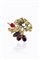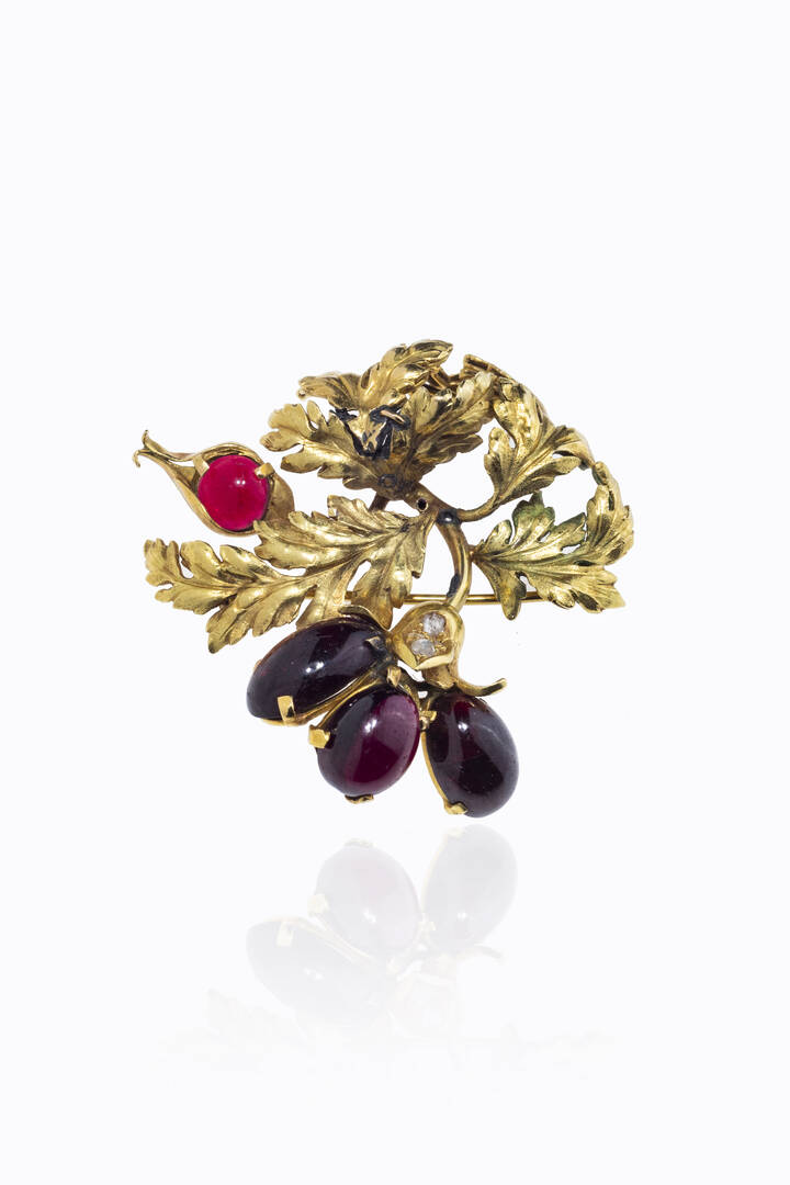 in oro giallo, a forma di fiore con gocce di granati cabochon. Rosette di diamanti per totali ct 0,20 ca. Mancanze