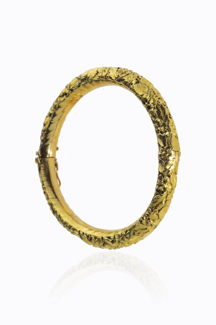 in oro giallo, anni '920. lavorato a canna vuota, con decori floreali. Presenti ammaccature e rottura alla base