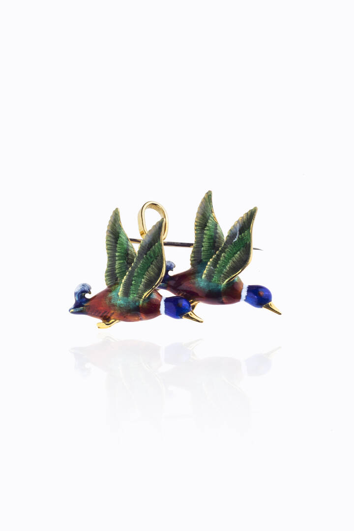 in oro giallo raffigurante due anatre in volo, interamente smaltate