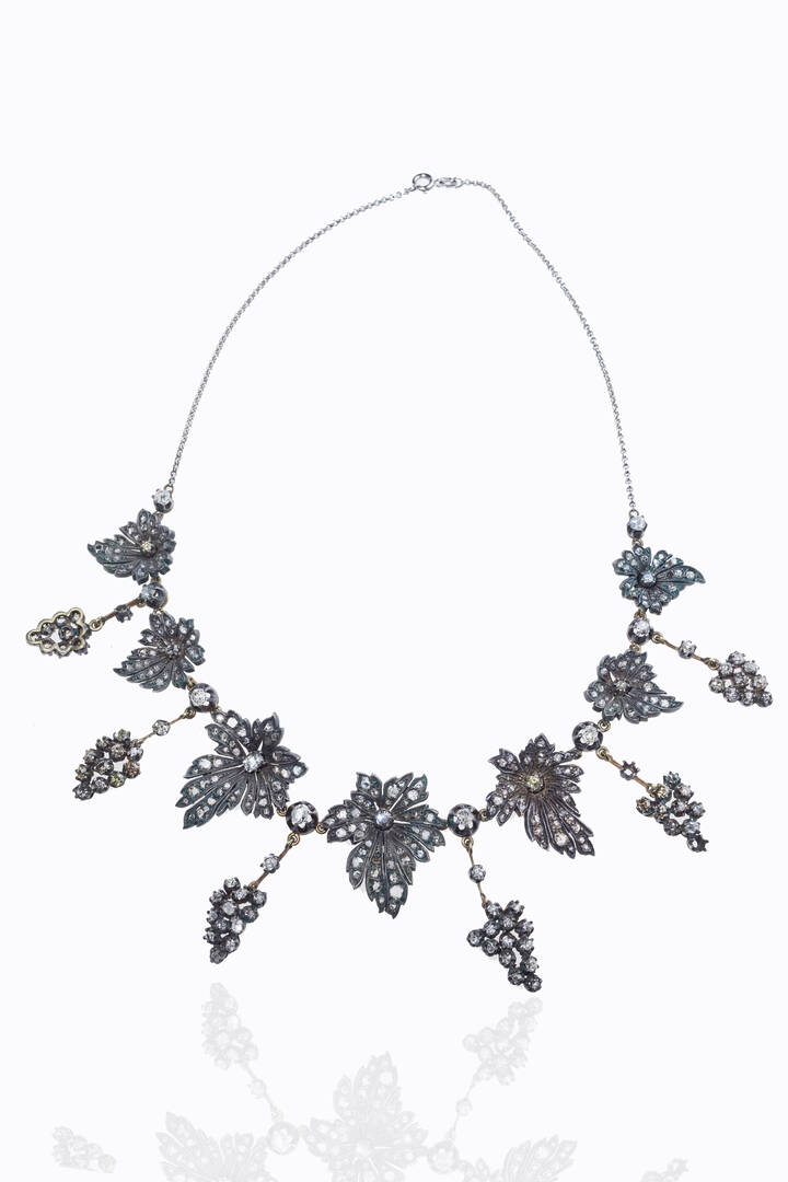 in oro bianco, parte centrale del XIX secolo in argento ed oro a bassa caratura con foglie e tralci d'uva in diamanti taglio brillante di vecchio e rosette per totali ct 6,0 ca (sei mancanti)