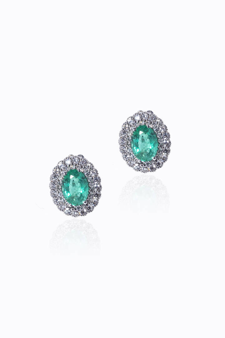in oro bianco, a lobo, con due smeraldi taglio ovale per totali ct 1,42 ca e doppio contorno di diamanti taglio brillante per totali ct 0,58 ca, probabile colore G-H, purezza IF-VVS