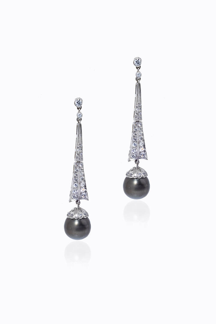 pendenti, in oro 14 Kt, con corpo geometrico in diamanti taglio brillante e 8/8 per totali ct 1,10 ca, terminanti con due perle Tahiti a goccia del diam. di mm 12,0 ca