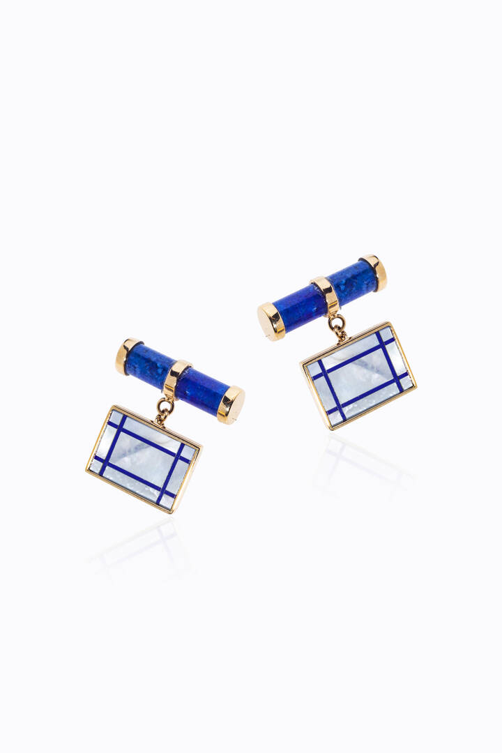 in oro rosa, di forma rettangolare con inserti in madreperla e fasce in lapislazzuli; barretta in lapislazzuli