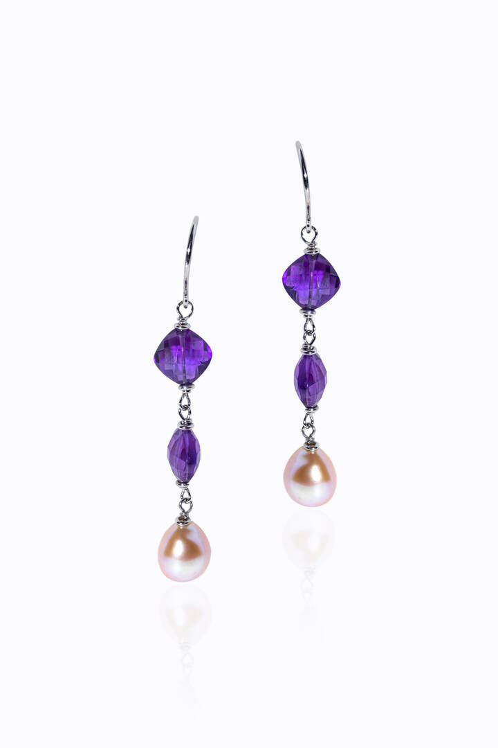 pendenti, ad amo, con ametiste taglio rotondo sfaccettate, terminante con due perle di acqua dolce nei toni del rosa