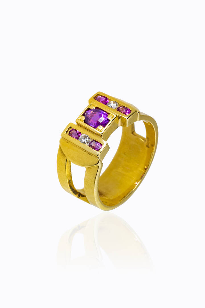 in oro giallo, sommità geometrica, con al centro ametiste taglio ovale e due diamanti taglio brillante per totali ct 0,05 ca, probabile colore G-H, purezza IF-VVS
