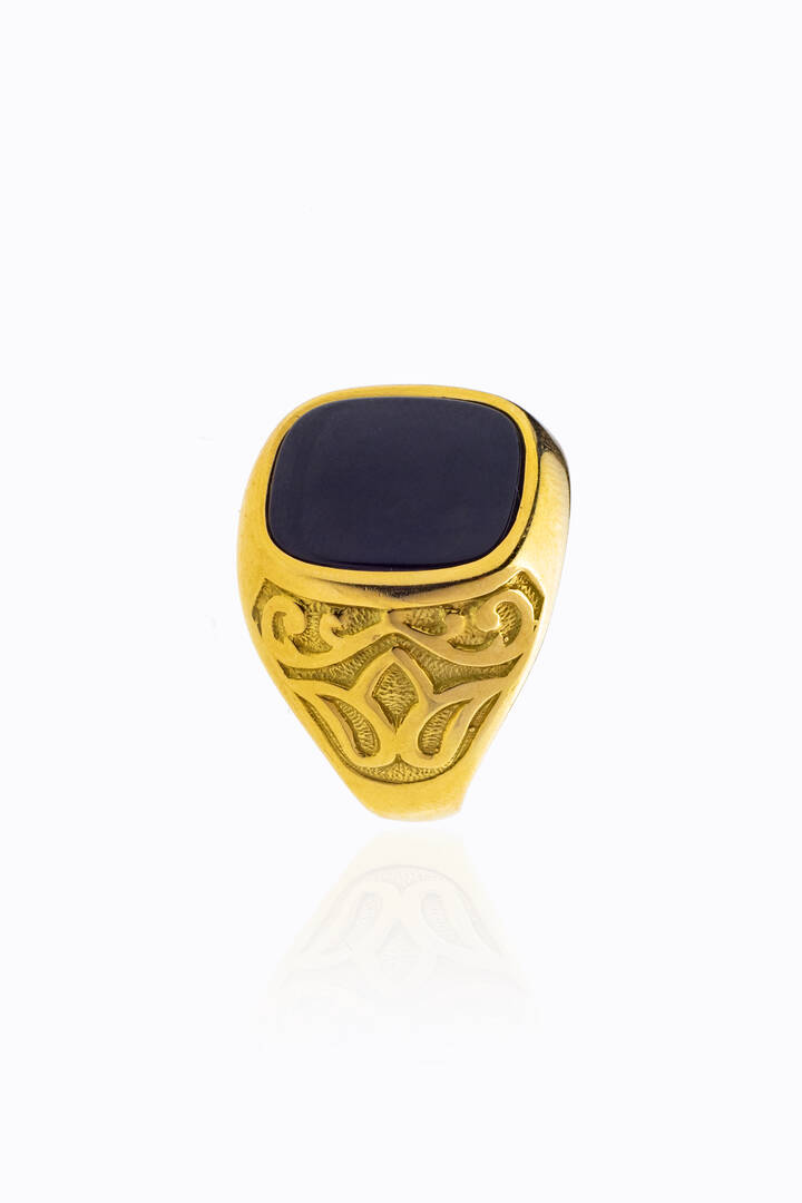 in oro giallo, laterali incisi, con al centro inserto in onice.