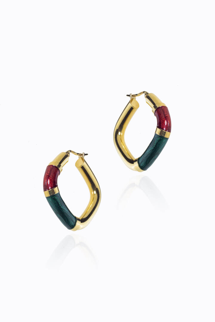 in oro giallo, a cerchio squadrato, con smalto verde e rosso al centro