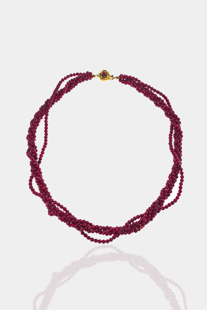 composto da cinque fili di sfere di corallo mediterraneo del diam di mm 3,8 ca. Chiusura a fiore in argento dorato