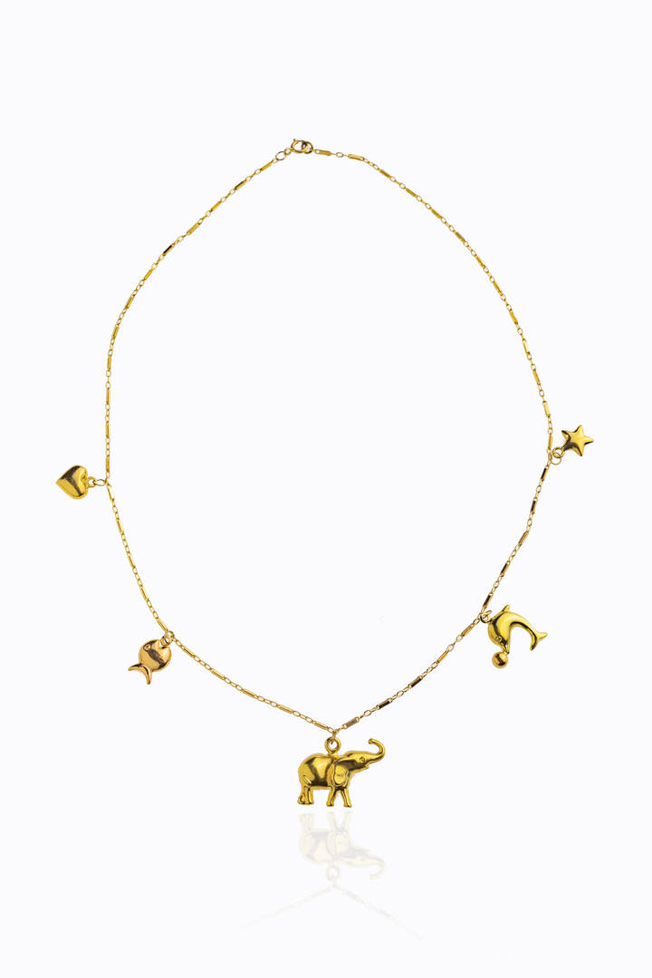 in oro giallo e rosa in oro a bassa caratura con cinque charms pendenti raffiguranti una stella, un cuore, un pesce, un delfino con palla e un elefante