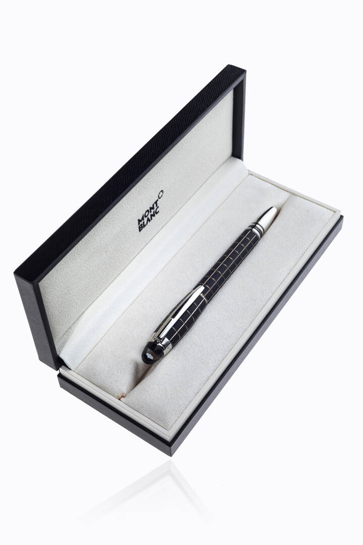 Stilografica "Montblanc", modello "Starwalker". Corpo e cappuccio in gomma con decoro a righe. Emblema "Montblanc" bianco nella parte superiore del cappuccio. Pennino in oro giallo 14 Kt