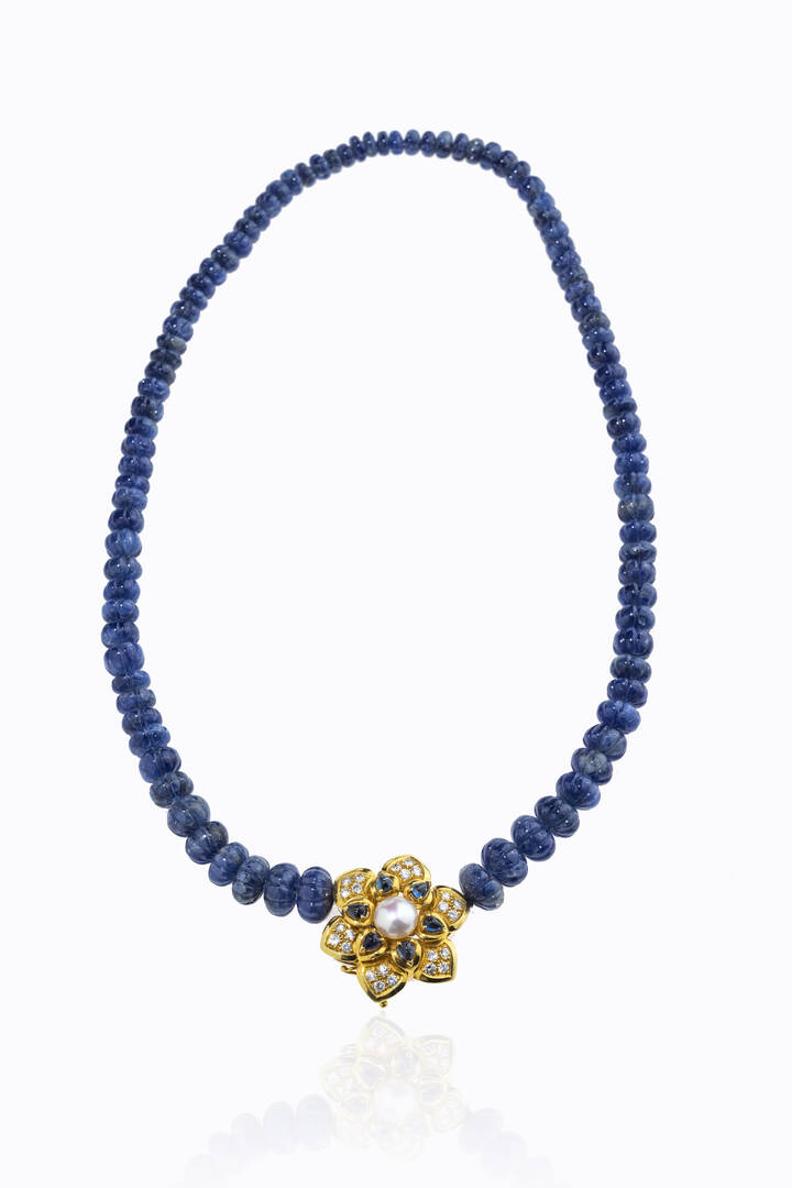 composto da dischi di zaffiri fesonati a scalare. Chiusura a fiore in oro giallo con perla centrale di mm 8 ca, zaffiri cabochon e diamanti taglio brillante per totali ct 0,50 ca