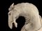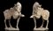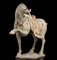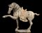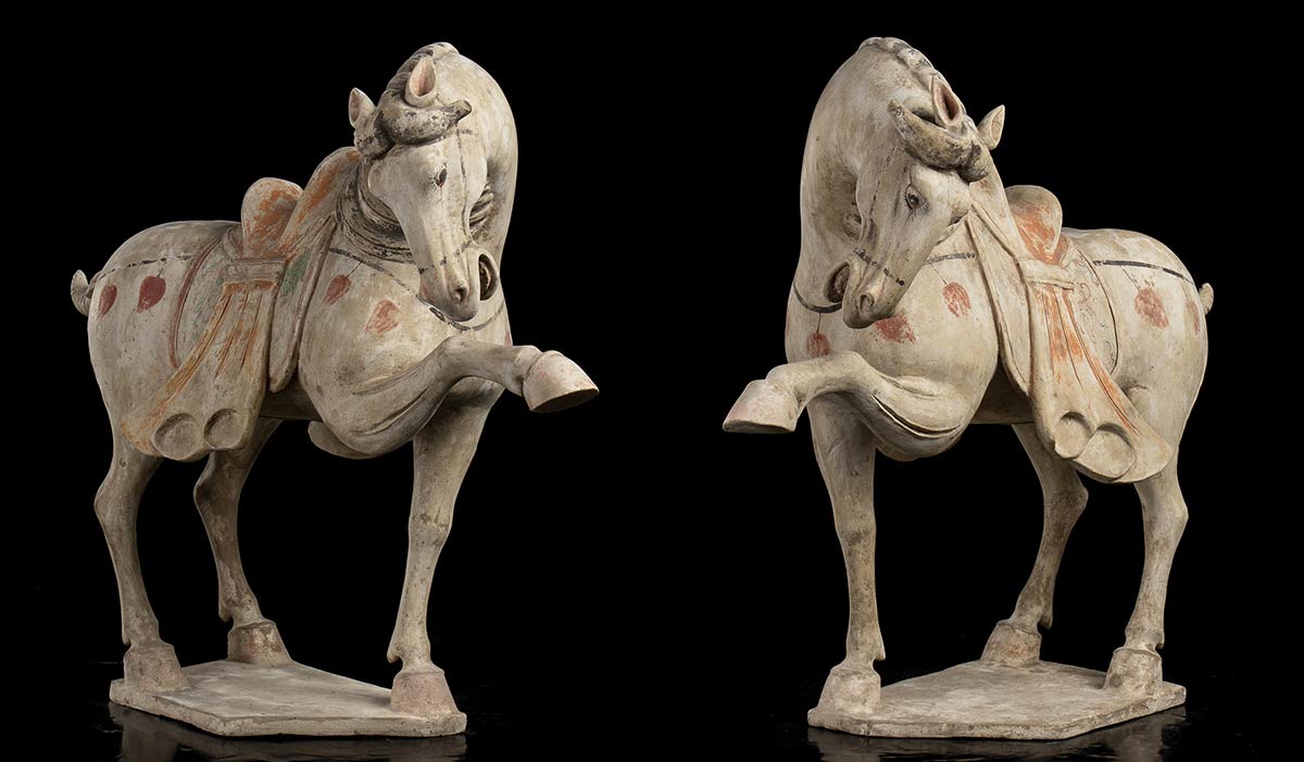 I due cavalli con tre zampe sostenute da base, una delle zampe anteriori sollevata, entrambi con collo e testa in accentuata torsione, la sella con stralcio di tessuto sui fianchi, i dettagli dipinti in policromia.