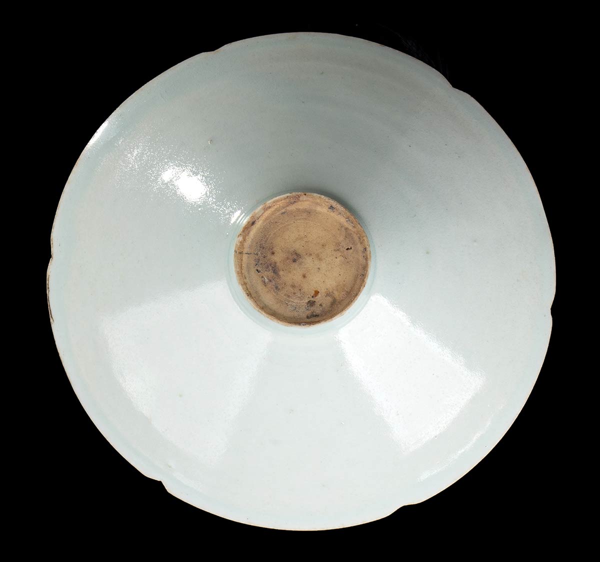 La ciotola ha orlo sagomato in sei lobi, sulla superficie esterna fiori stilizzati impressi, l'invetriatura di tonalità celeste chiaro.