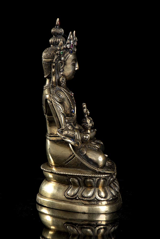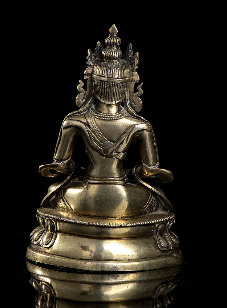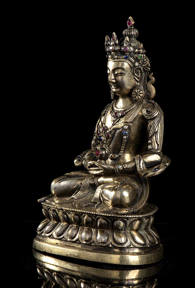 AMITAYUS IN LEGA DI RAME CON INTARSI IN PIETRE Sino-tibetano, XVIII-XIX secolo