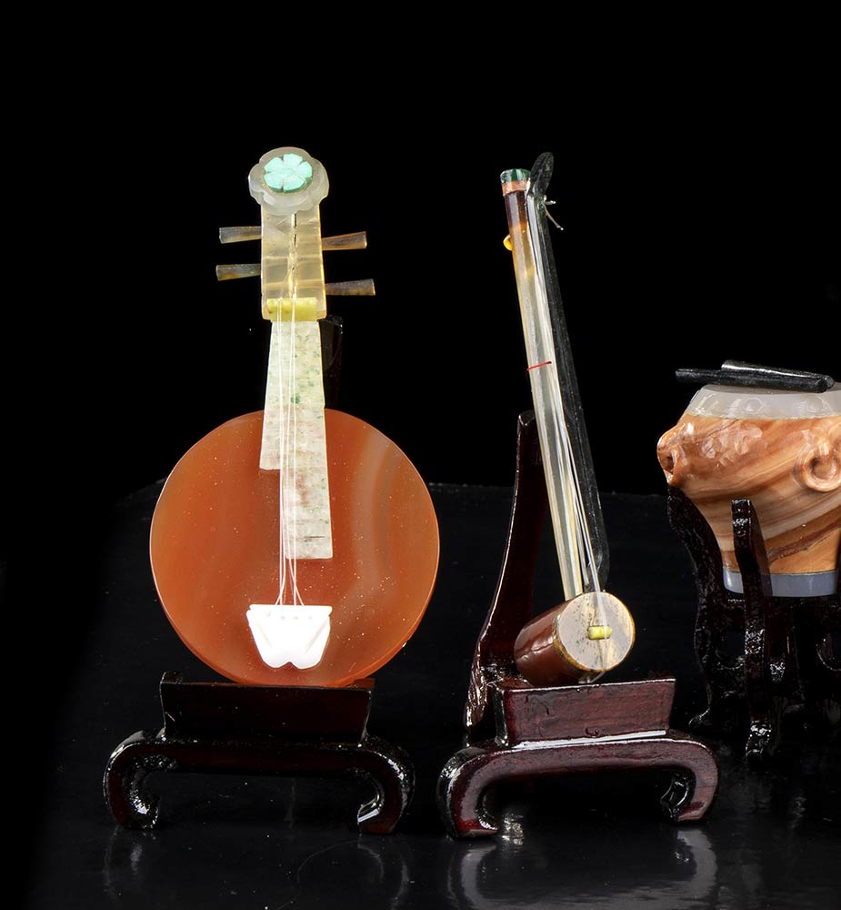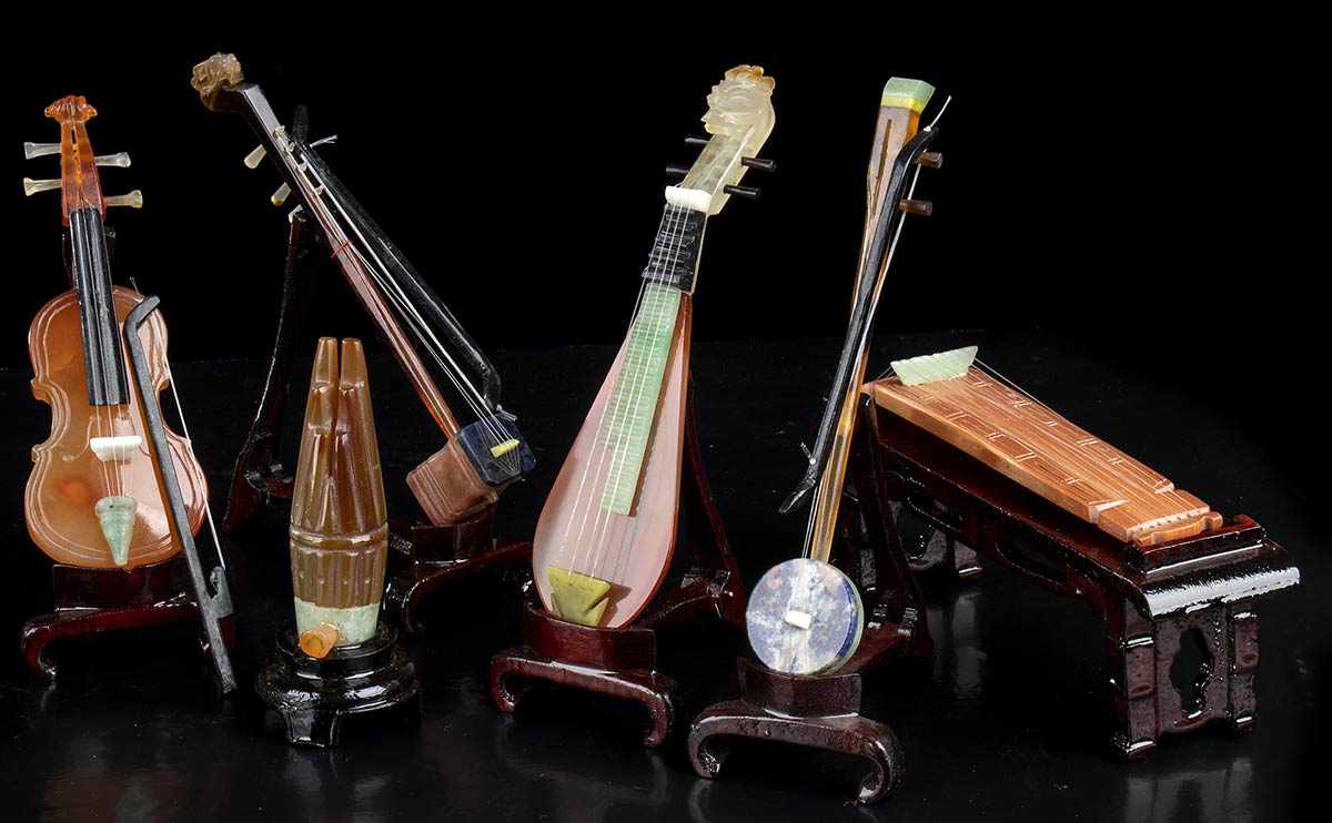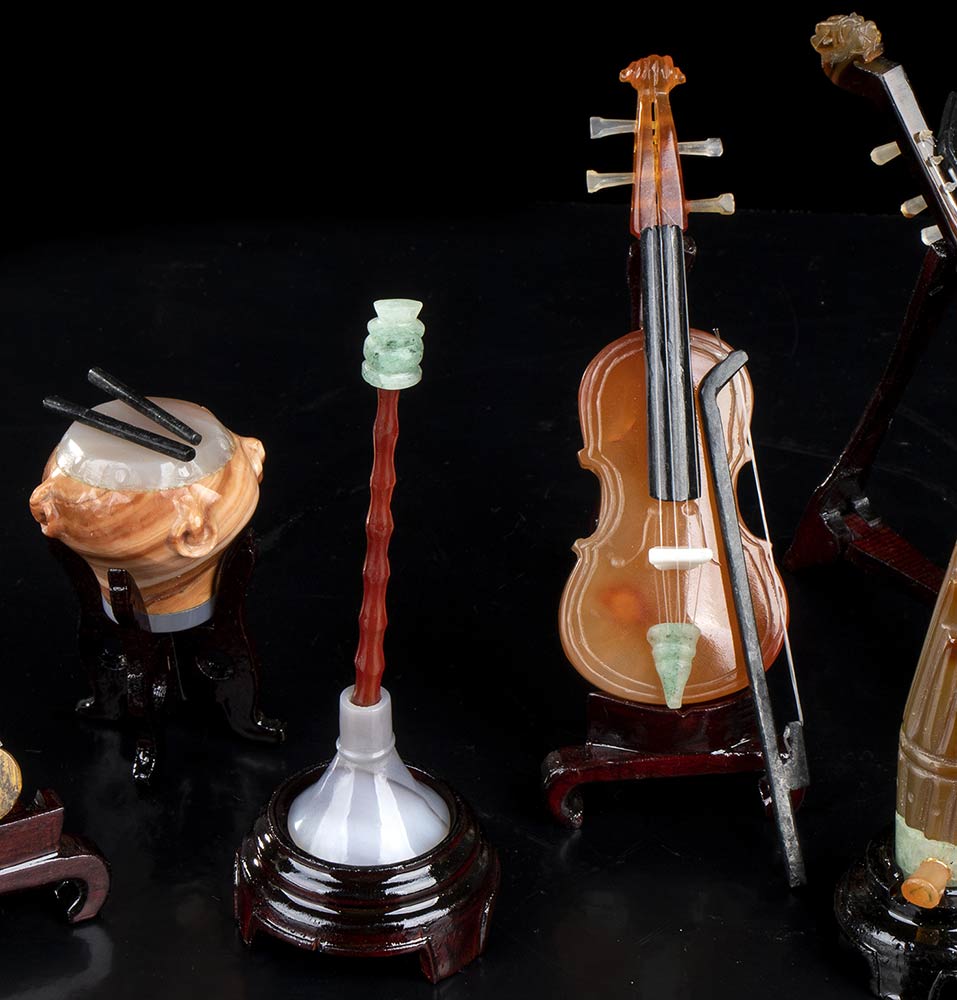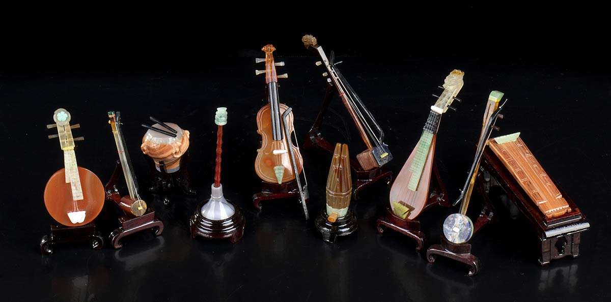 DIECI MINIATURE DI STRUMENTI MUSICALI IN PIETRA Cina, XX secolo