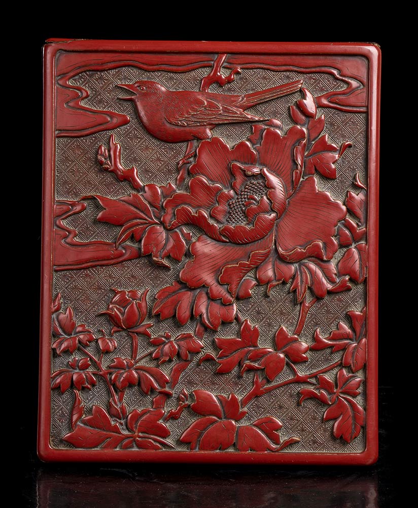 L'esterno del coperchio lavorato a rilievo con una scena di uccello tra i fiori.