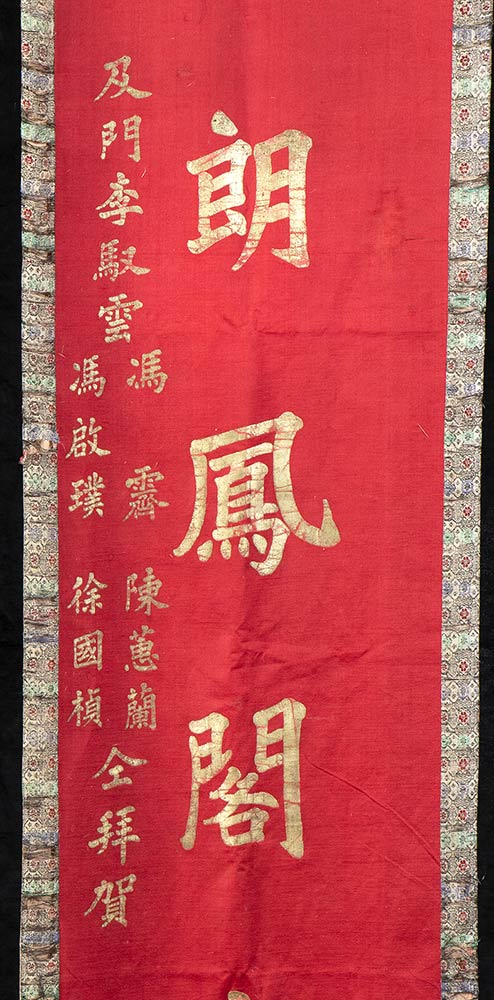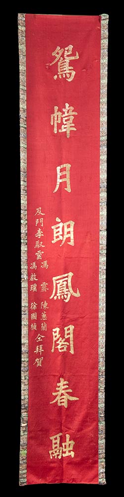 A fondo rosso, presenta iscrizione鴛幃月朗鳳閣春 in caratteri di maggiori dimensioni, alla quale si affianca iscrizione in caratteri di minori dimensioni.