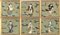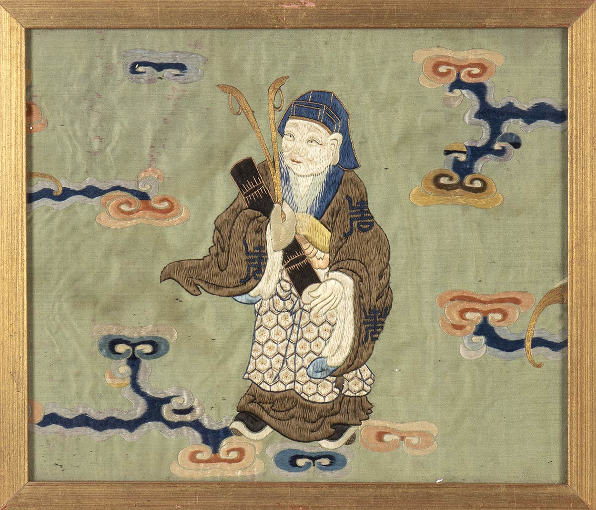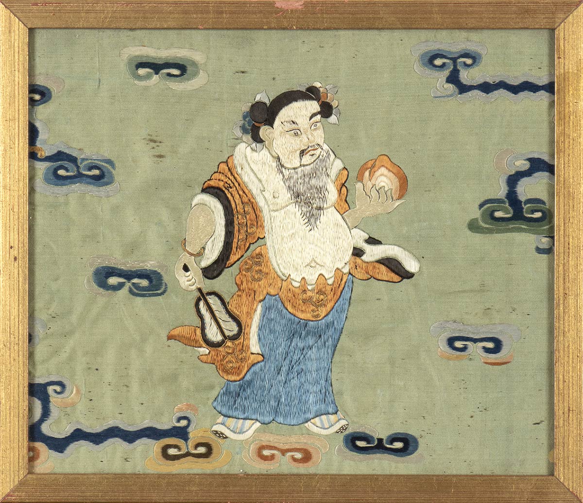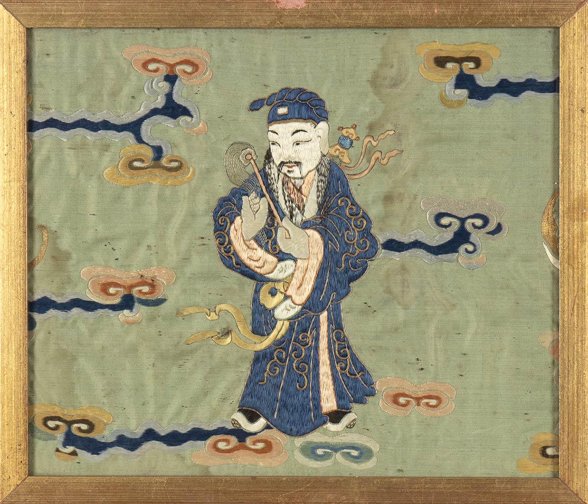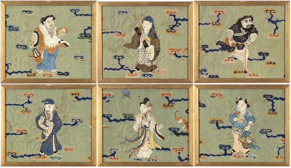 Ognuno raffigurante uno degli Otto Immortali Taoisti con i suoi attributi e circondato da nuvole stilizzate, cornici in legno e vetro protettivo.