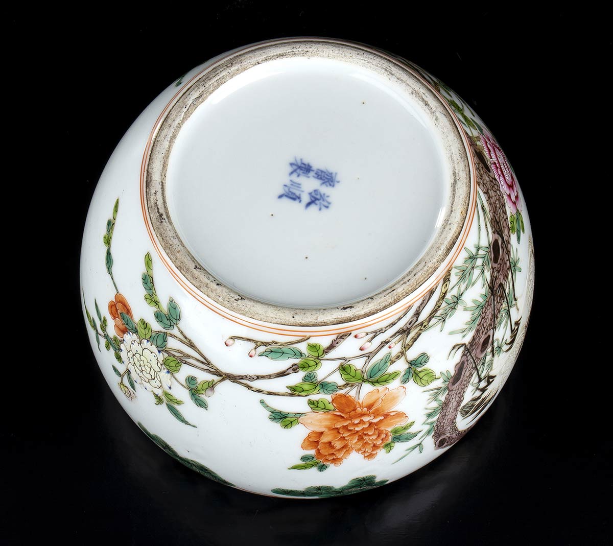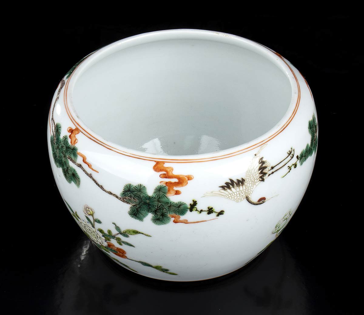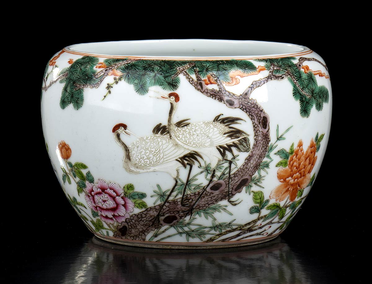 La decorazione sull'esterno della parete consiste di fiori, alberi di pino e gru, marchio a quattro caratteri al centro della base.