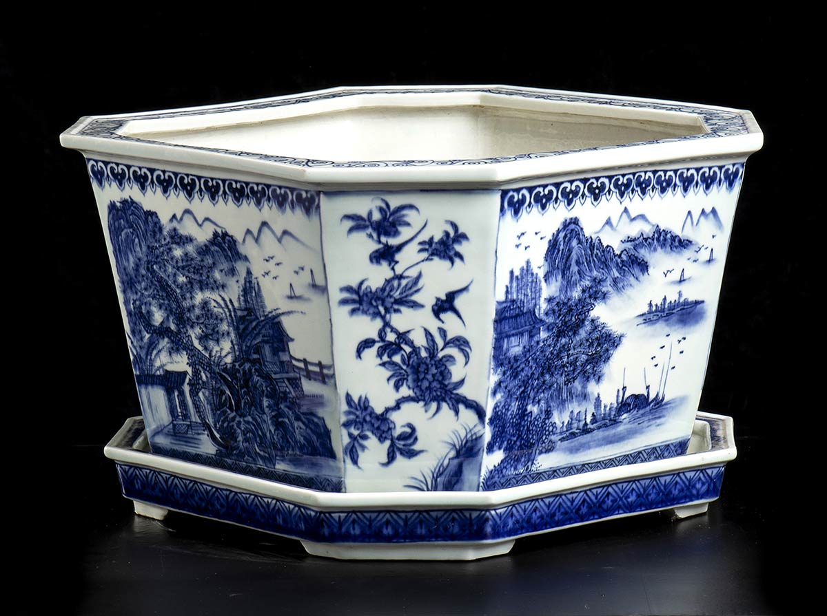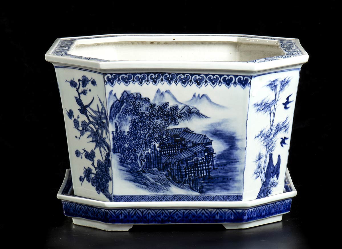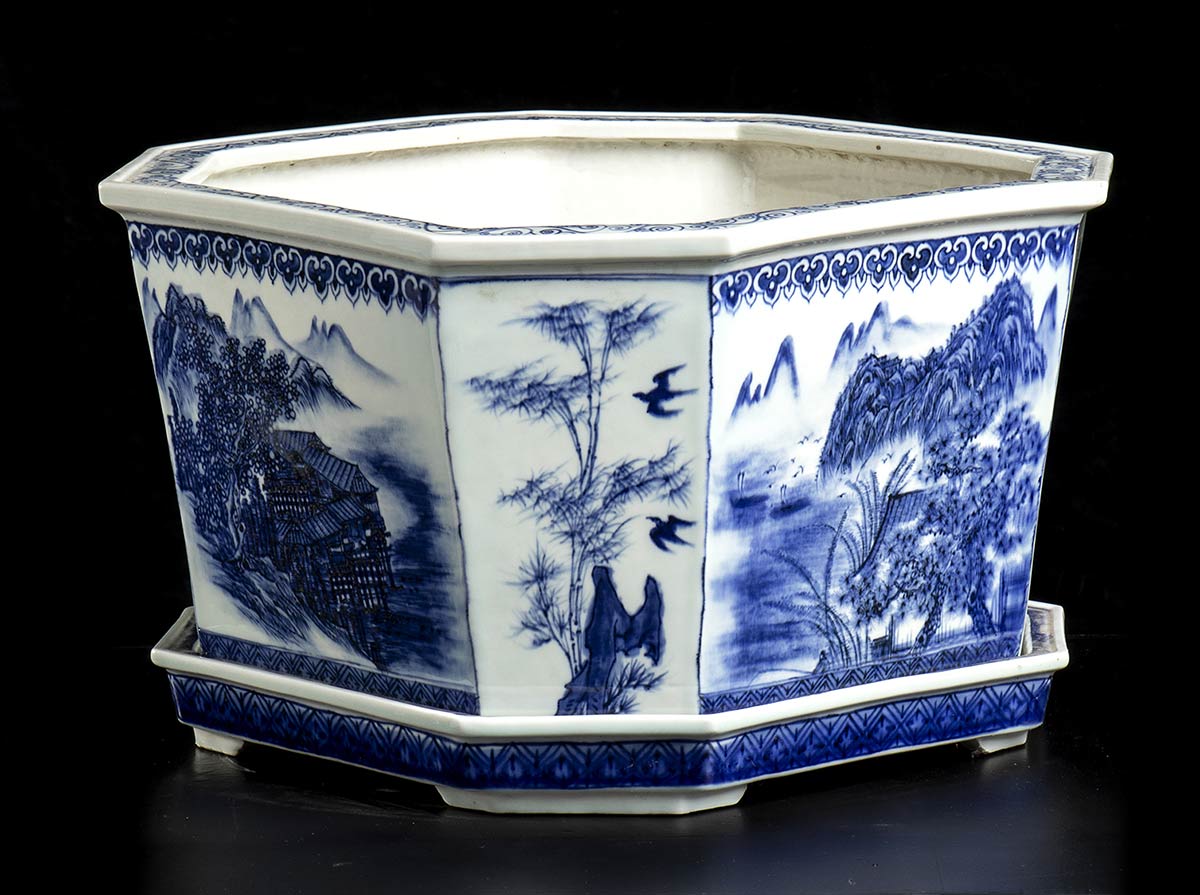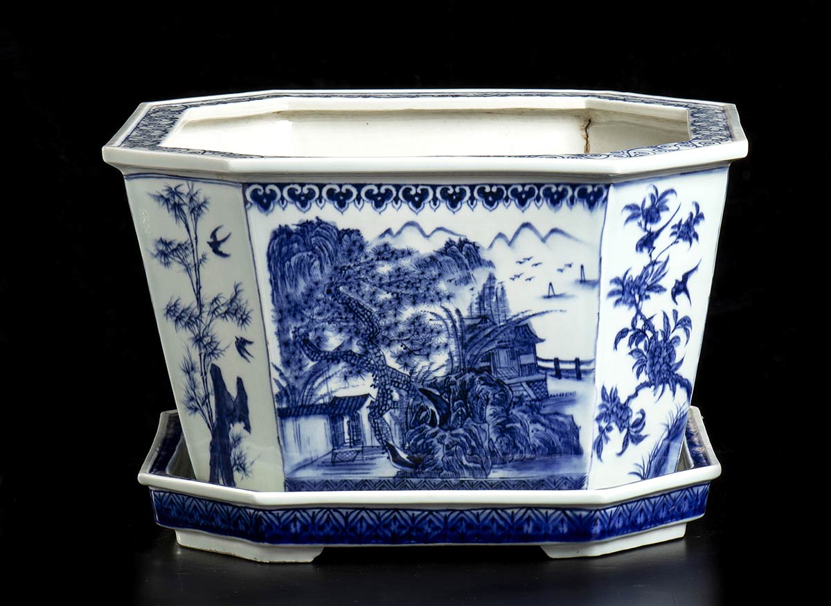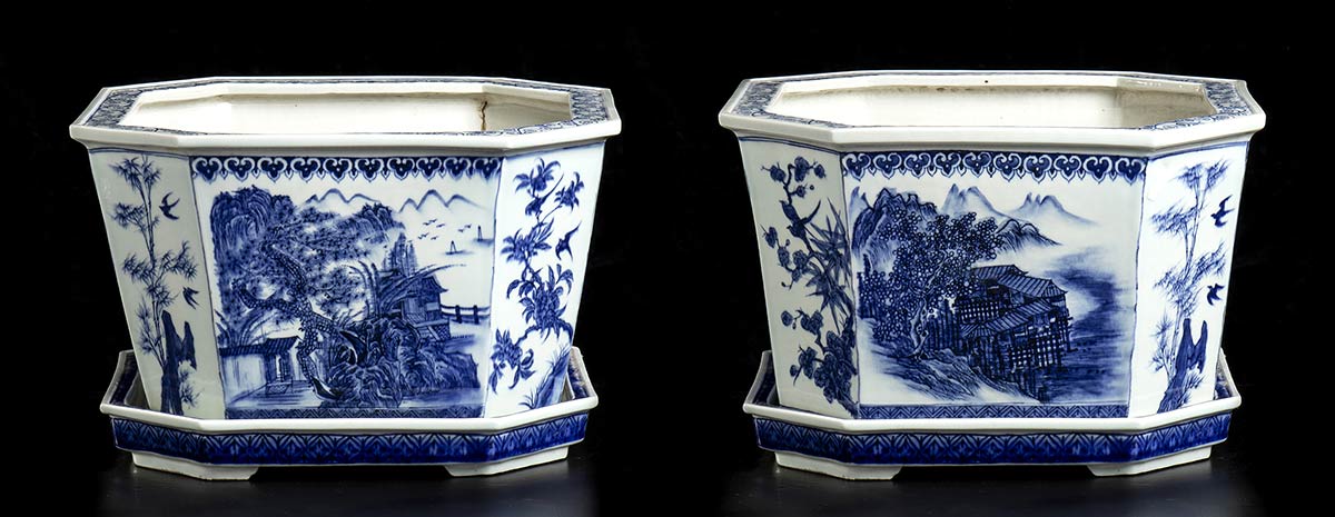 COPPIA DI CACHEPOTS CON VASSOI IN PORCELLANA 'BIANCO E BLU' Cina, XX secolo