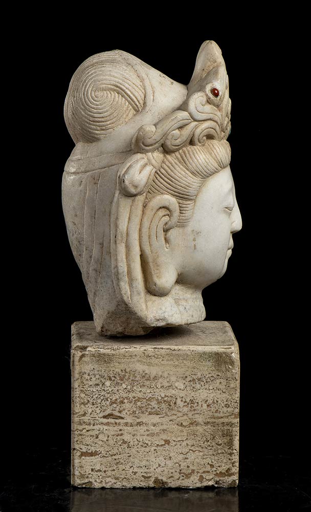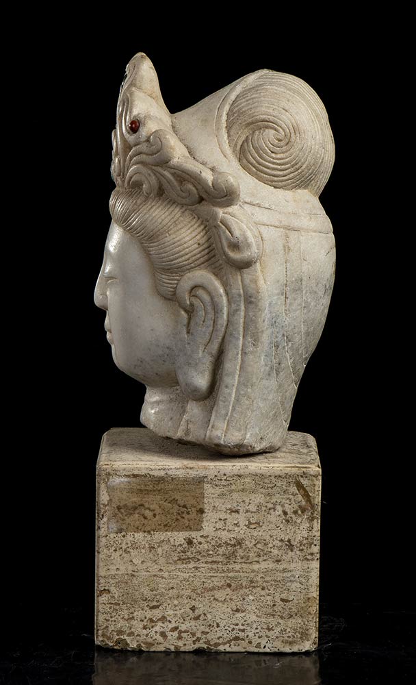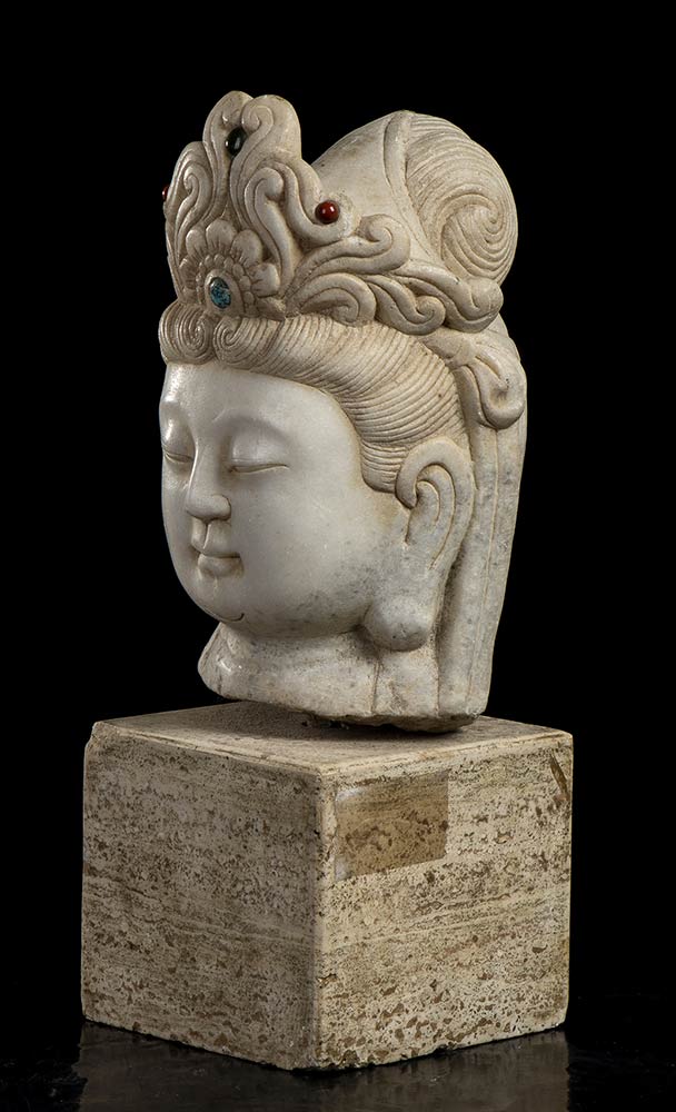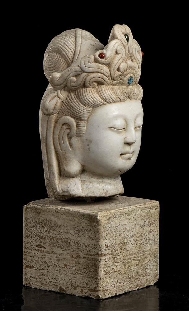 TESTA DI BODHISATTVA IN MARMO BIANCO CON INSERTI DI PIETRE DURE Cina, XX secolo