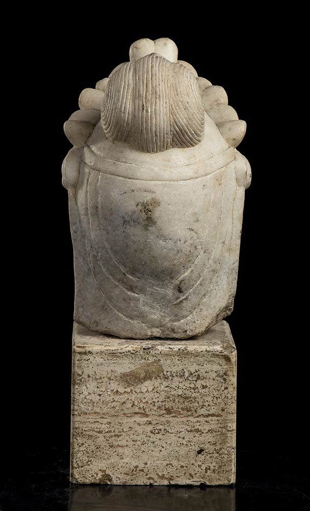 TESTA DI BODHISATTVA IN MARMO BIANCO CON INSERTI DI PIETRE DURE