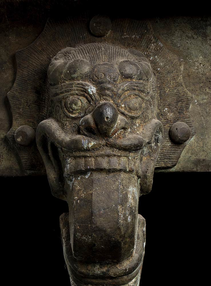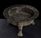 A sezione circolare e ampia tesa piatta, il contenitore è sostenuto da tre zampe che fuoriescono dalle fauci di una testa di animale fantastico.
