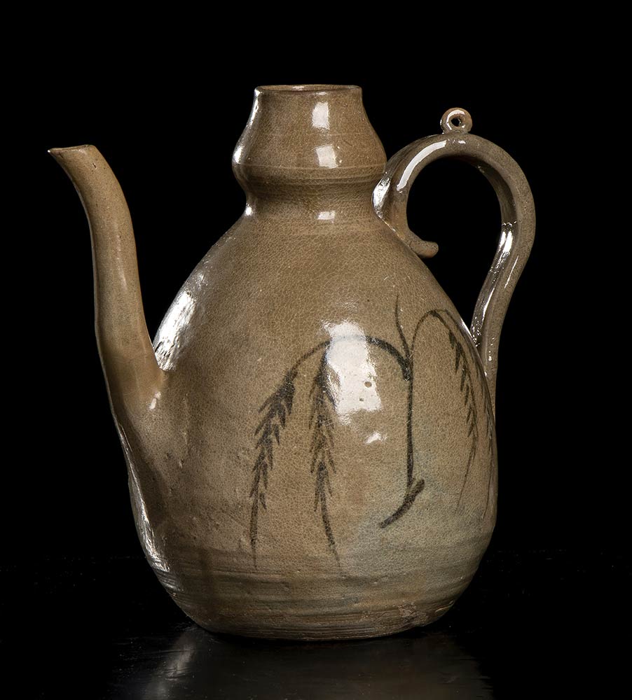 Lo stile immediato e corsivo della decorazione si adatta perfettamente alla superficie mossa delle pareti del corpo di questo versatoio, rivestito di una vetrina céladon di una sottile tonalità dalla calda intensità.