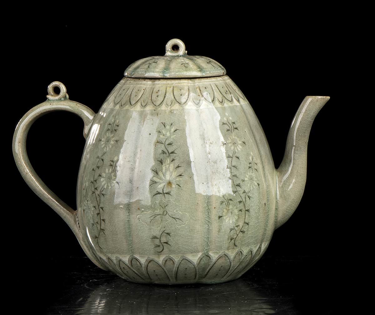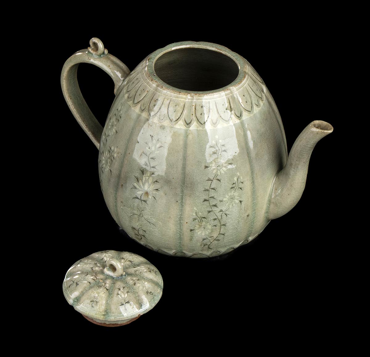 VERSATOIO CON COPERCHIO IN CERAMICA CON INVETRIATURA CÉLADON E DECORO A INTARSIO DI INGOBBIO BIANCO E BRUNO Corea, periodo Goryeo, XII-XIII secolo