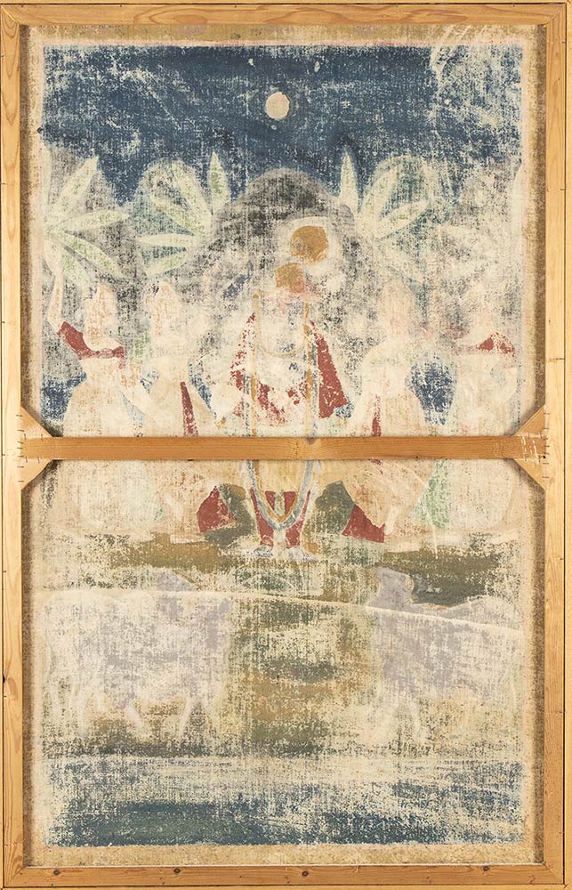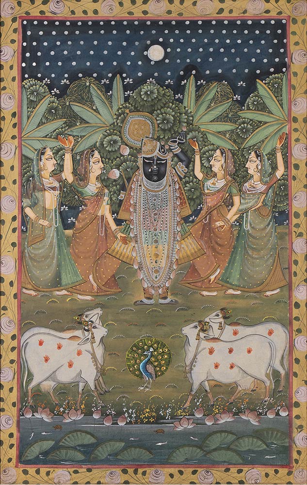 Il dipinto raffigura al centro Shrinathji, l'avatar di Krishna di soli sette anni, affiancato da due coppie di danzatrici, in basso al centro si vede un pavone e ai due lati due coppie di vacche, l'ambientazione consiste di un cielo con luna e stelle, di alberi e palme e in basso di fiori di loto; cornice in metallo.