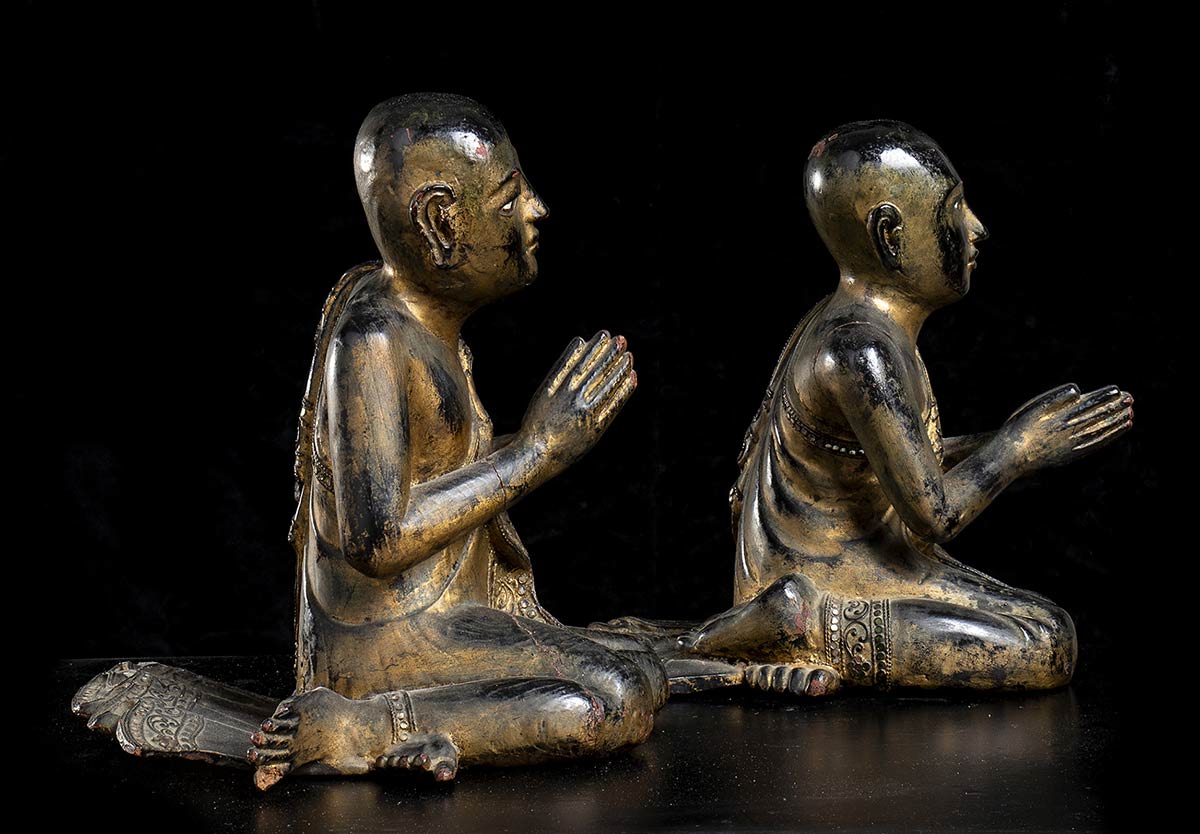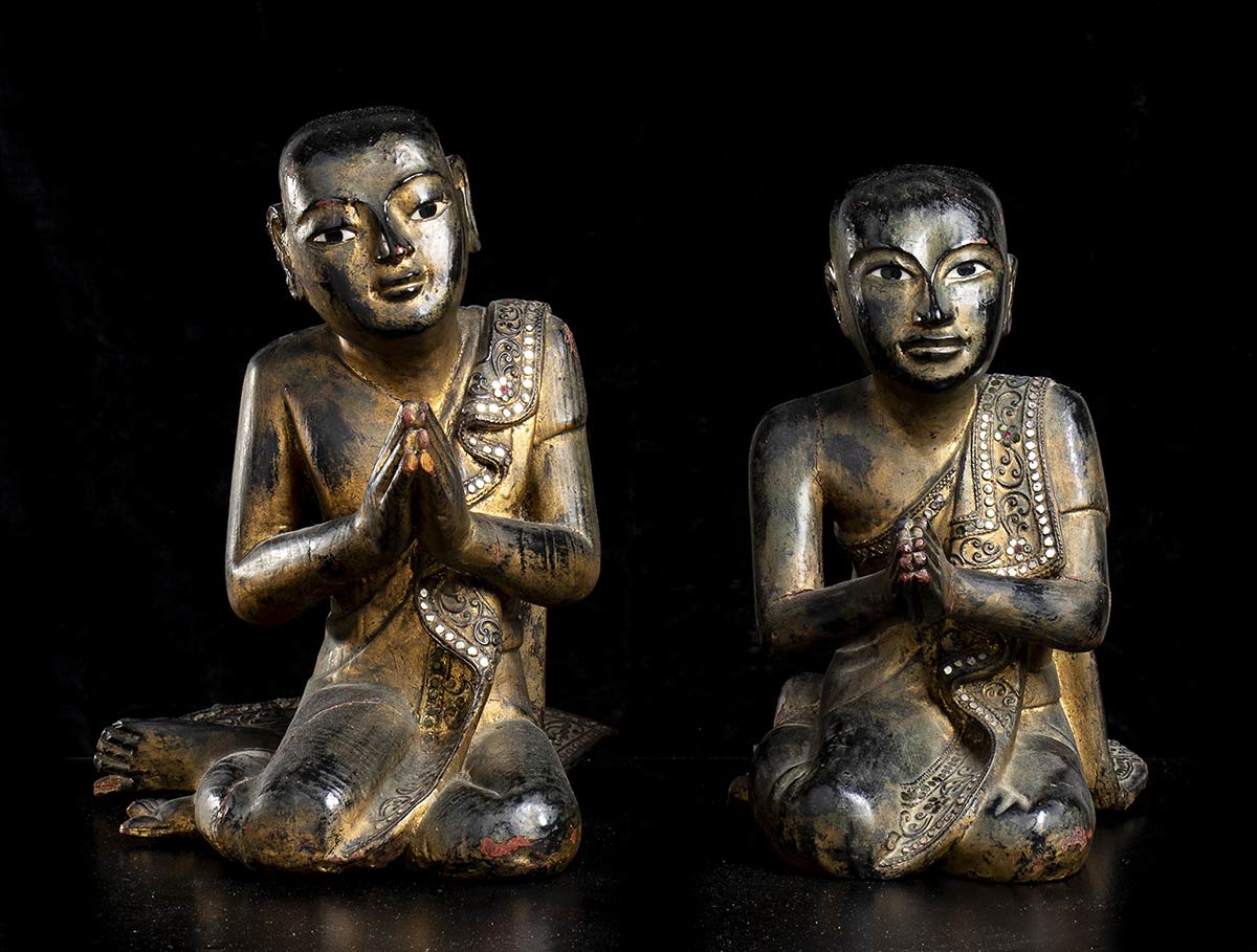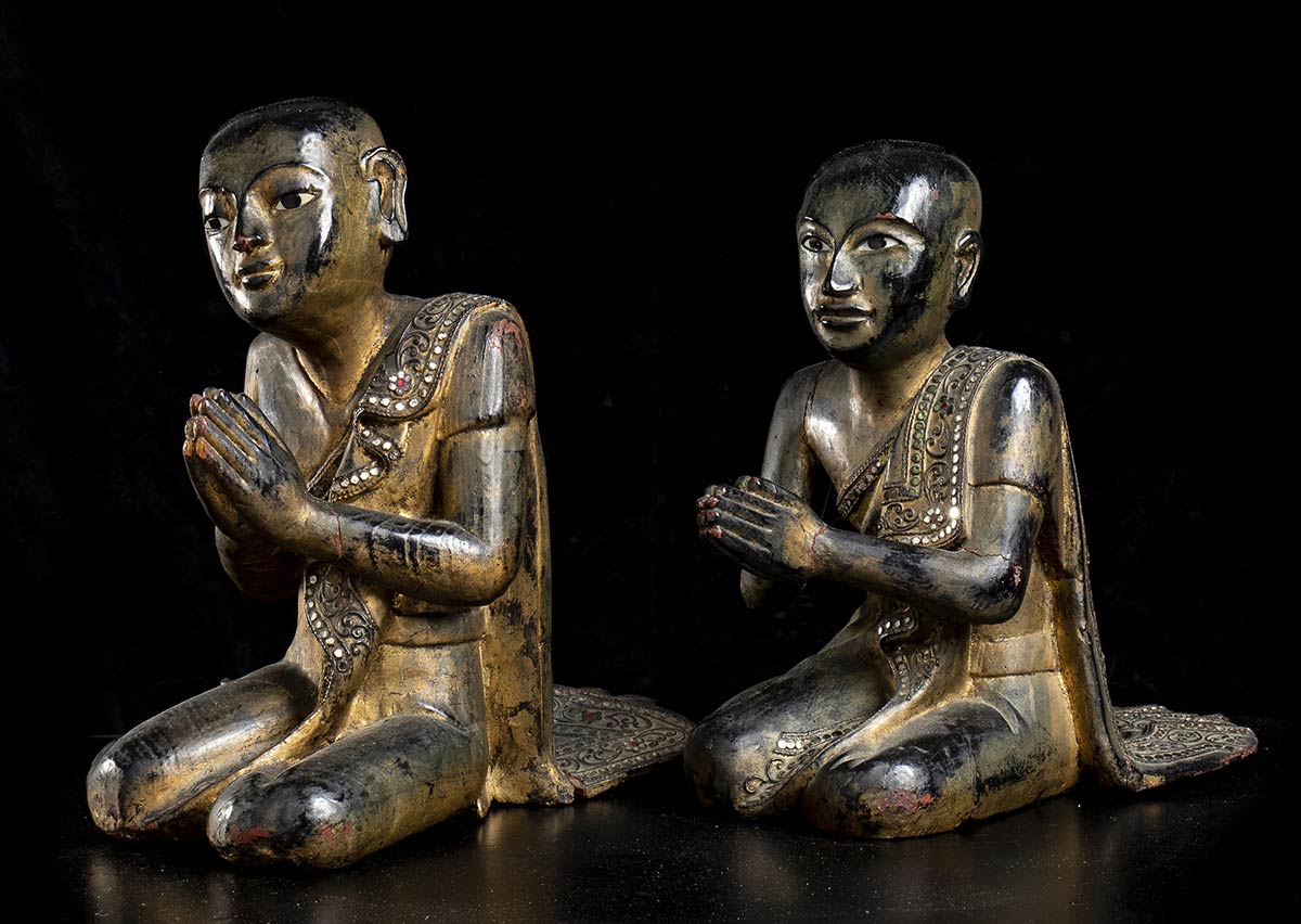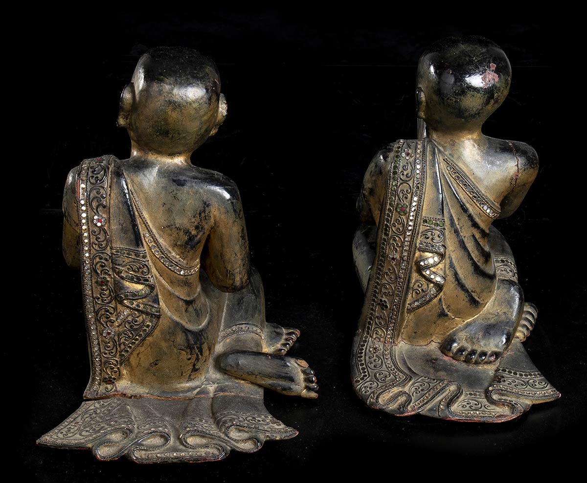 COPPIA DI MONACI IN LEGNO CON INSERTI IN VETRO Birmania, XX secolo