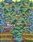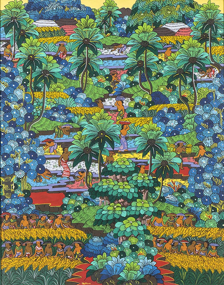 DIPINTO A COLORI SU TELA CON PAESAGGIO CON VILLAGGIO E FIGURE Bali, Ubud, seconda metà del XX secolo