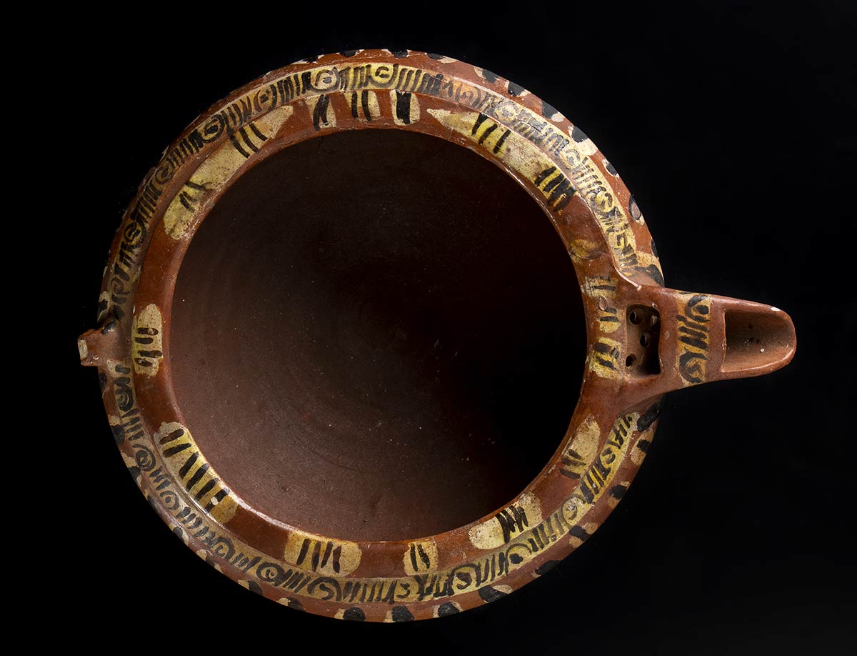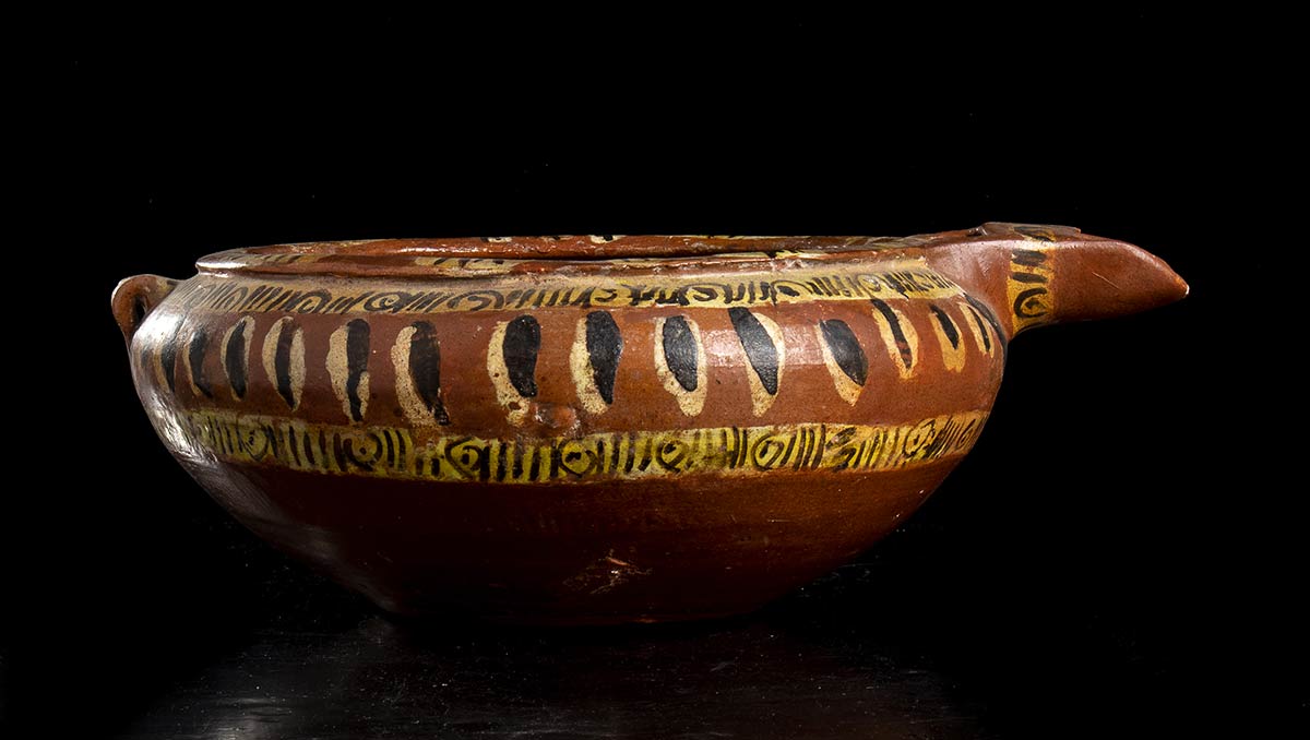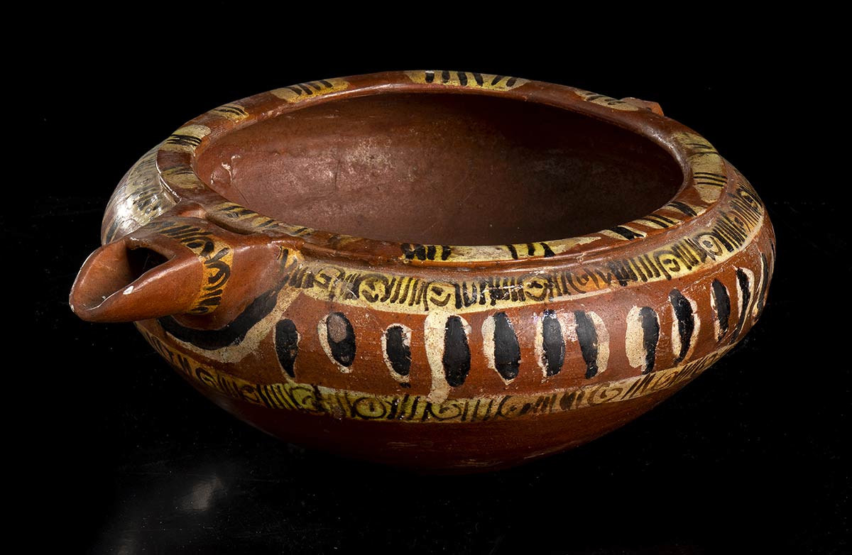 A sezione circolare, presenta sull'esterno una decorazione geometrica a smalti bianco e marrone scuro su fondo rosso-mattone e ocra.