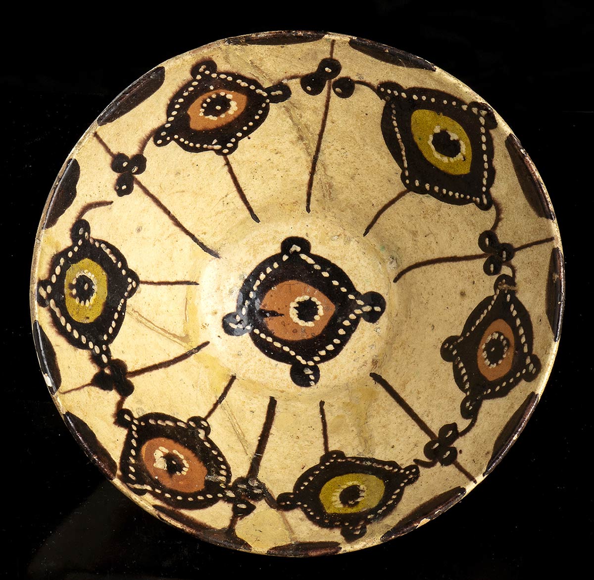 La decorazione all'interno - dipinta a smalti marrone, giallo-ocra, arancio e bianco - consiste di motivi geometrici all'incirca circolari disposti al centro del fondo e radialmente sulla parete; restaurata.