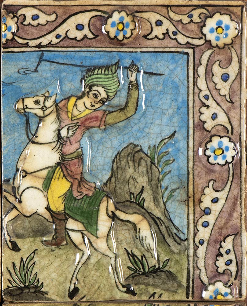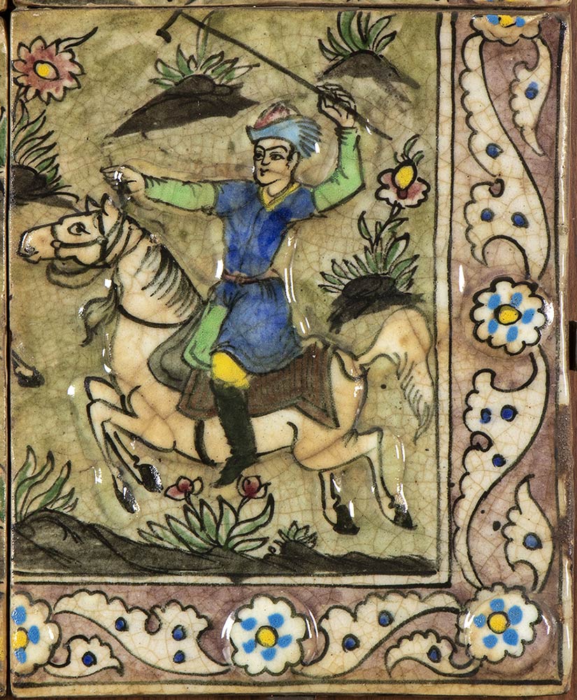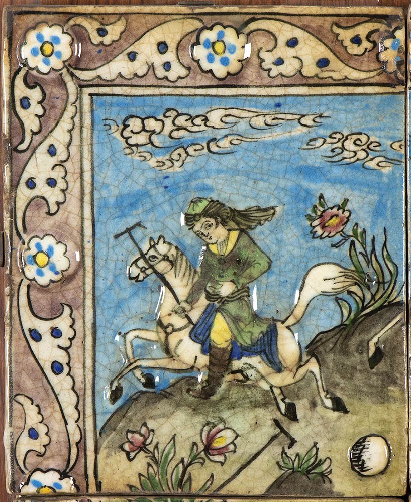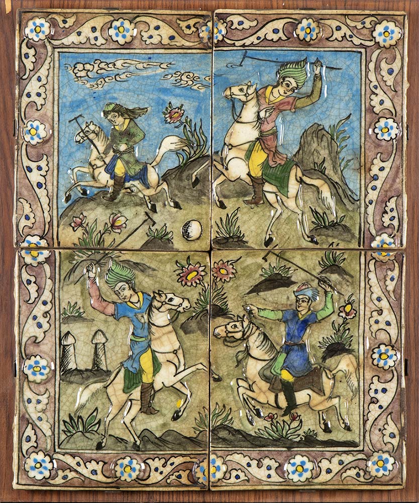 Le quattro piastrelle – dipinte in ricca policromia con dettagli a rilievo e invetriate – compongono un'unica scena racchiusa entro cornice di arabesco floreale, la quale consiste di quattro uomini a cavallo alle prese con una partita di polo, fissate a panello in legno con staffe in metallo.