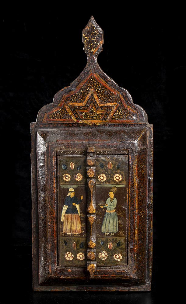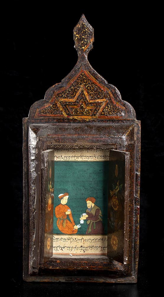 L'edicola in legno decorata in policromia con motivi geometrici e sulle ante all'esterno due figure e all'interno fiori e uccelli, la miniatura all'interno con una figura che offre una bevanda a un altro uomo, la scena racchiusa in alto e in basso da iscrizioni.