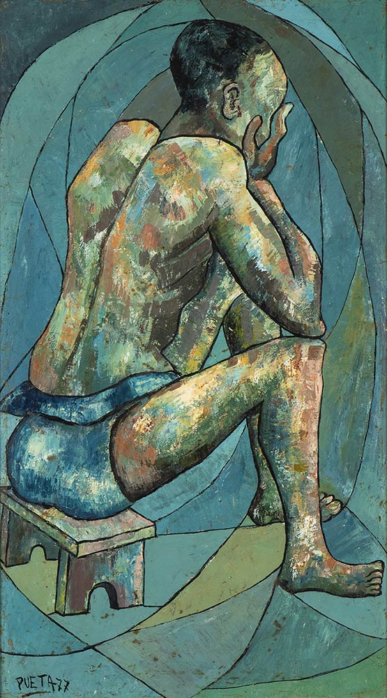 DIPINTO A COLORI SU TELA CON UOMO SEDUTO VISTO DI TRE QUARTI DA TERGO Africa, seconda metà del XX secolo
