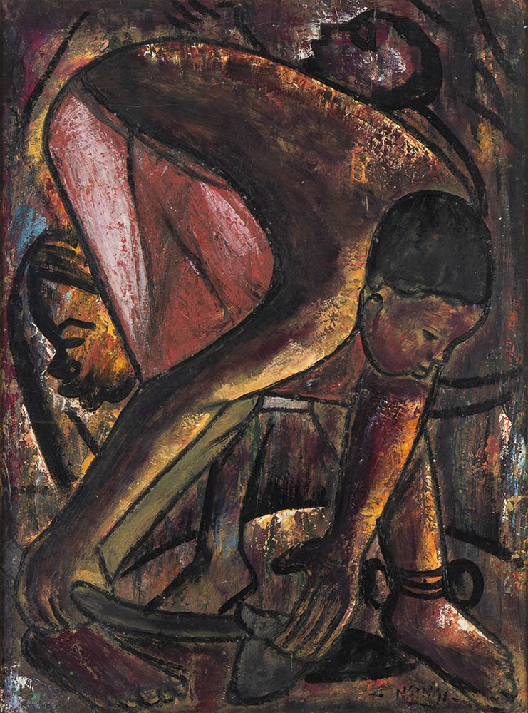 DIPINTO A COLORI SU TELA CON FIGURE AL LAVORO Africa, seconda metà del XX secolo