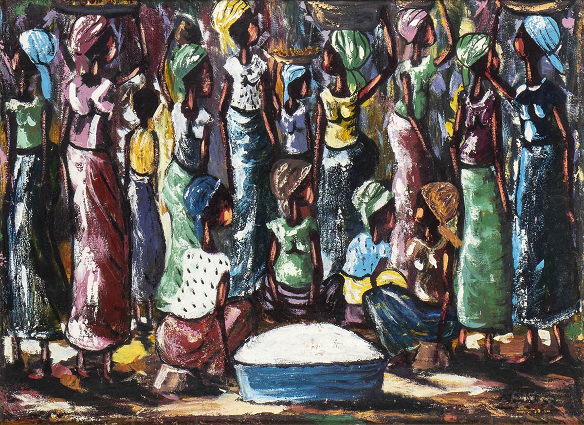 DIPINTO A COLORI SU TELA CON FIGURE FEMMINILI AL MERCATO Africa, seconda metà del XX secolo