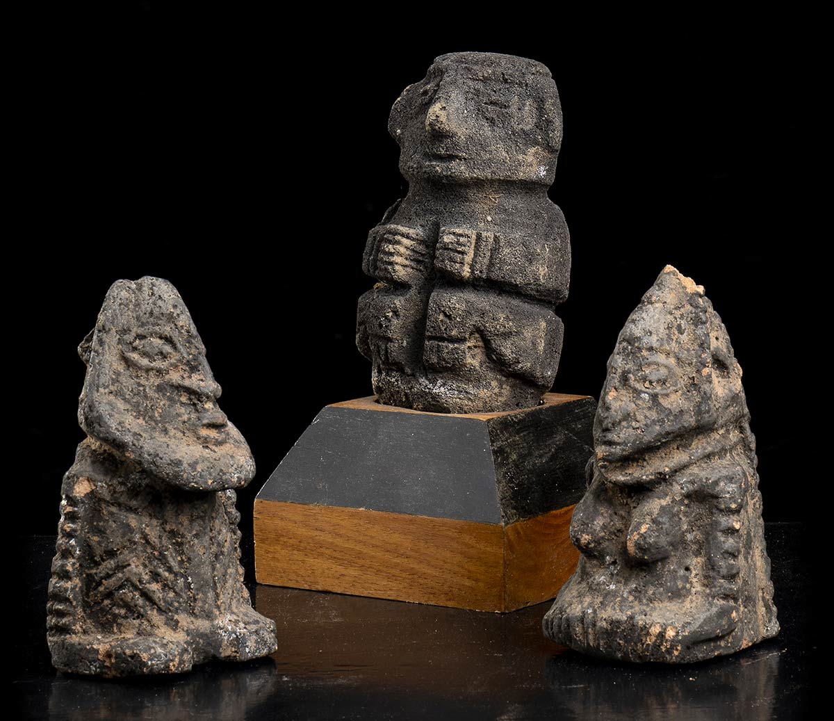 TRE FIGURE, DUE IN TERRACOTTA E UNA IN PIETRA stile precolombiano e Africa