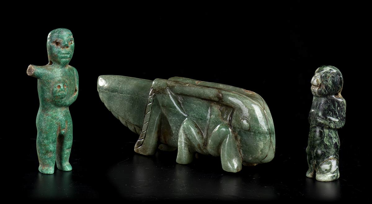 TRE OGGETTI IN PIETRA VERDE stile precolombiano