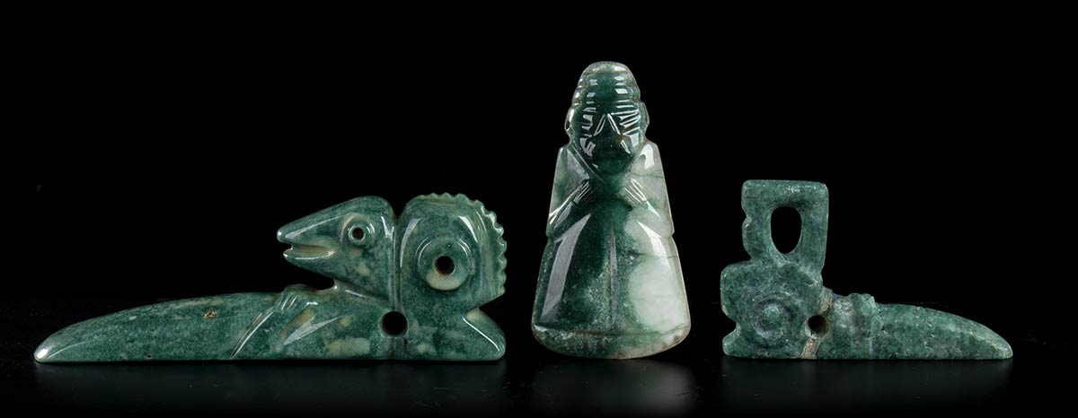 TRE OGGETTI IN PIETRA VERDE stile precolombiano